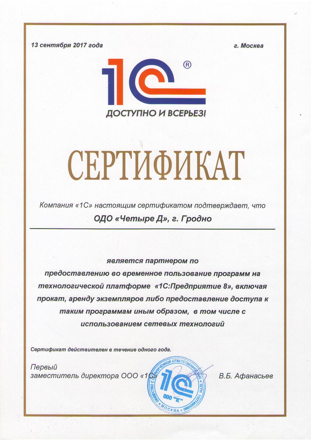 Сертификат «1С:Аренда программ» подтверждает то, что «Четыре Д» является официальным партнером по предоставлению во временное пользование программ на технологической платформе «1С:Предприятие 8» включая прокат, аренду экземпляров либо предоставление доступа к таким экземплярам иным способом, в том числе с использованием сетевых технологий.