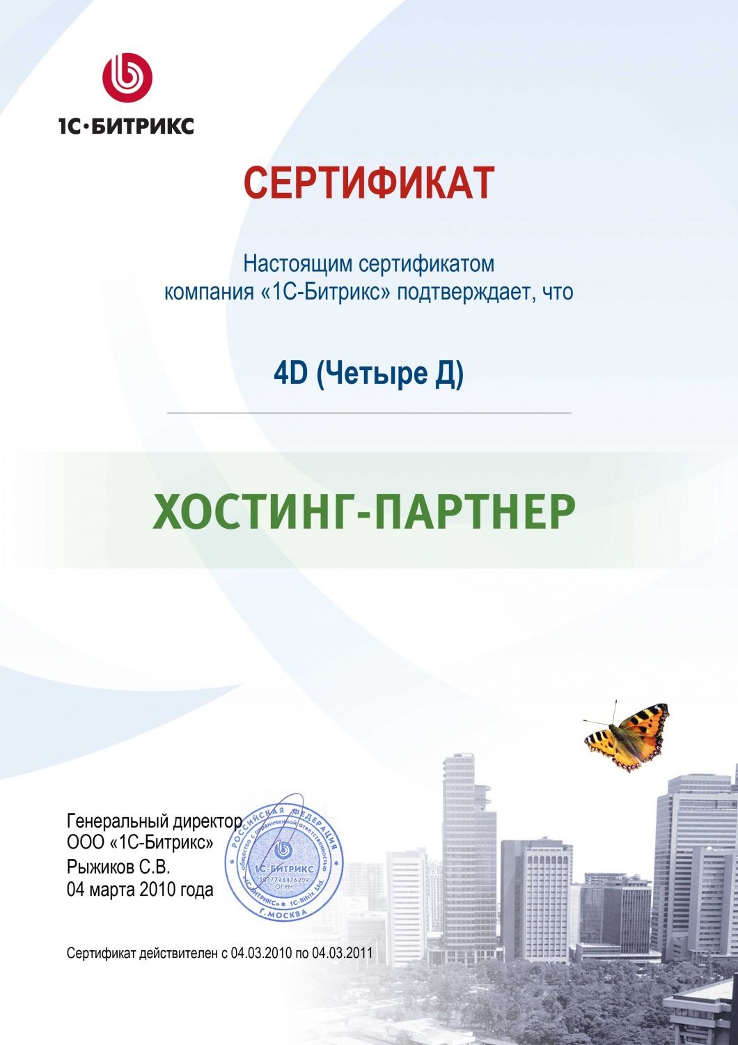Сертификат «Хостинг-партнер Битрикс24» означает, что представленные партнером тарифы хостинга соответствуют всем необходимым требованиям для установки и успешной работы продуктов «1С-Битрикс: Управление сайтом» и «1С-Битрикс: Корпоративный портал».